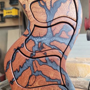 Lichtenburg fractal burning is his new favourite. Burning the wood creates beautiful features which he inlays with resin.